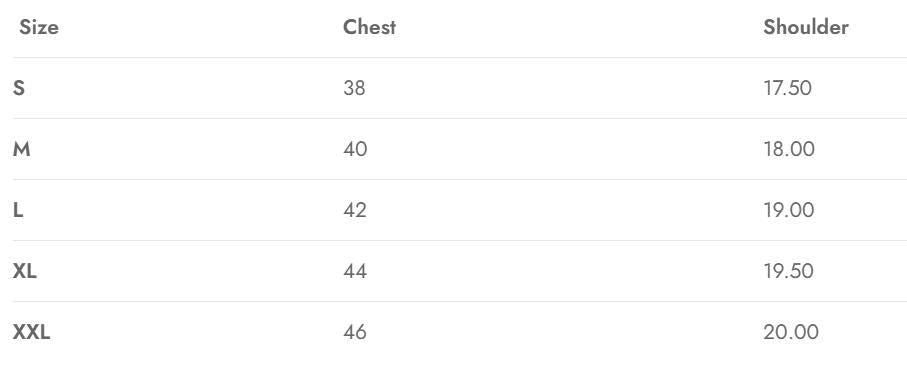 | Size | Chest (inches) | Waist (inches) | Hip (inches) |